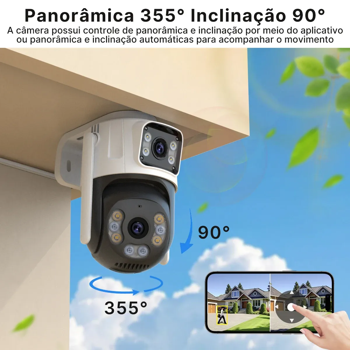 Essa Câmera WiFi com Visão Dupla e Auto Rastreamento acompanha o movimento automaticamente e elimina pontos cegos.